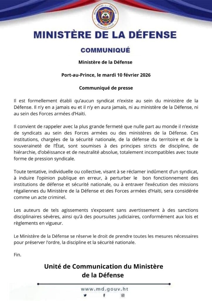 Communiqué de pressePar Jean Guiteau LAFAYE / À la Une, FAd'H, le ministère / 02/10/2026 Ministère de la Défense Port-au-Prince, le mardi 10 février 2026 Communiqué de presse
